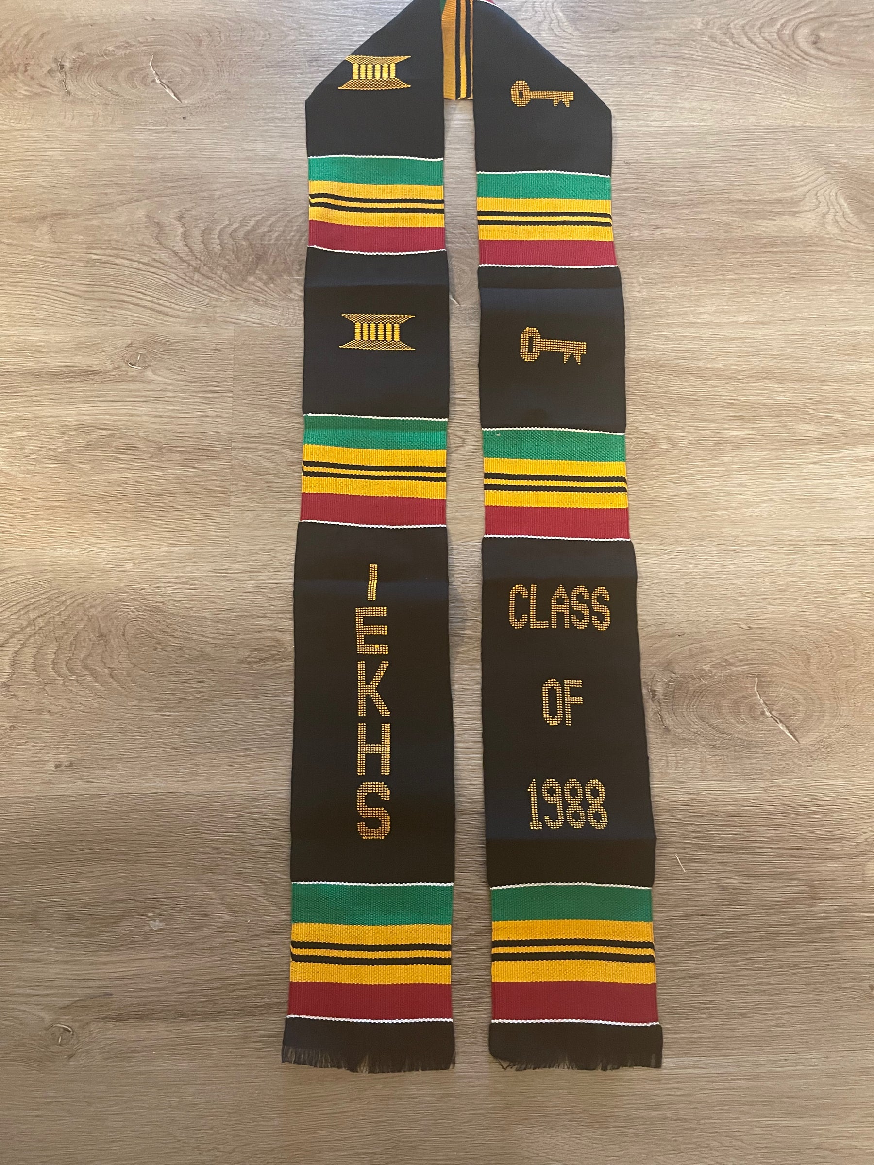 This Fully Customized Kente cloth graduation stole is authentically handwoven by artisans in Ghana. The durable fabric ensures that the stole is a long-lasting keepsake of your graduation and comes with its own garment care bag for preservation and safekeeping.